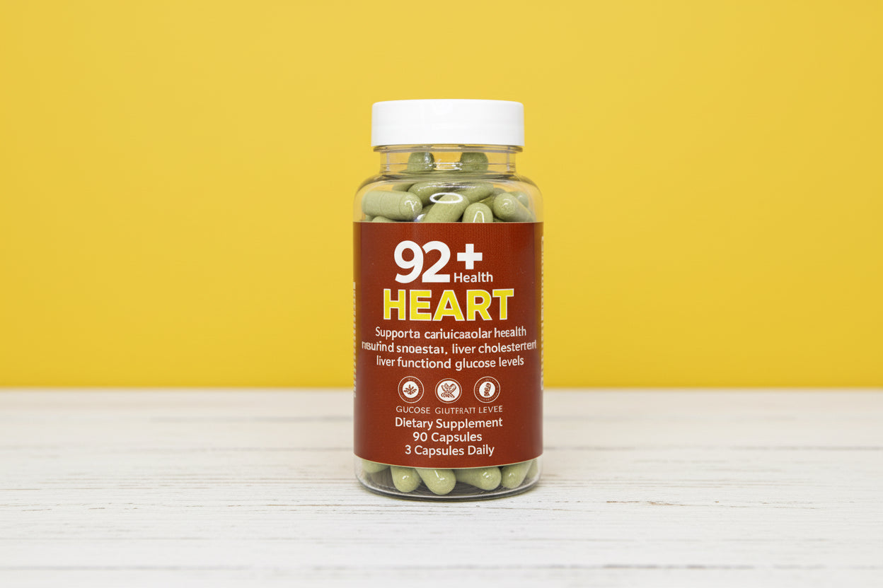 92+ Heart supplement bottle with Herbia Del Sapo capsules supporting cardiovascular health and balanced cholesterol levels